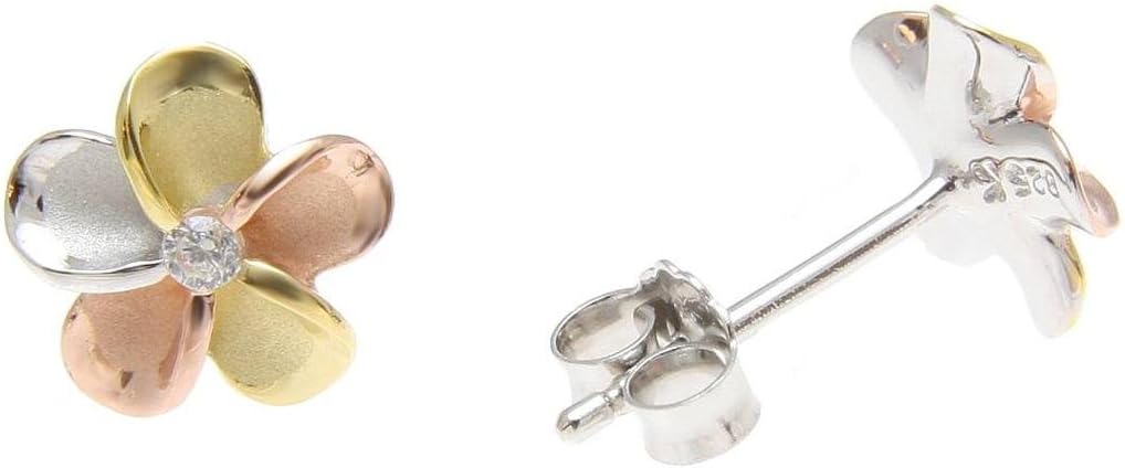 925 sterling silver yellow rose gold rhodium plated tricolor tricolor Hawaiian plumeria stud earrings cz 8mm