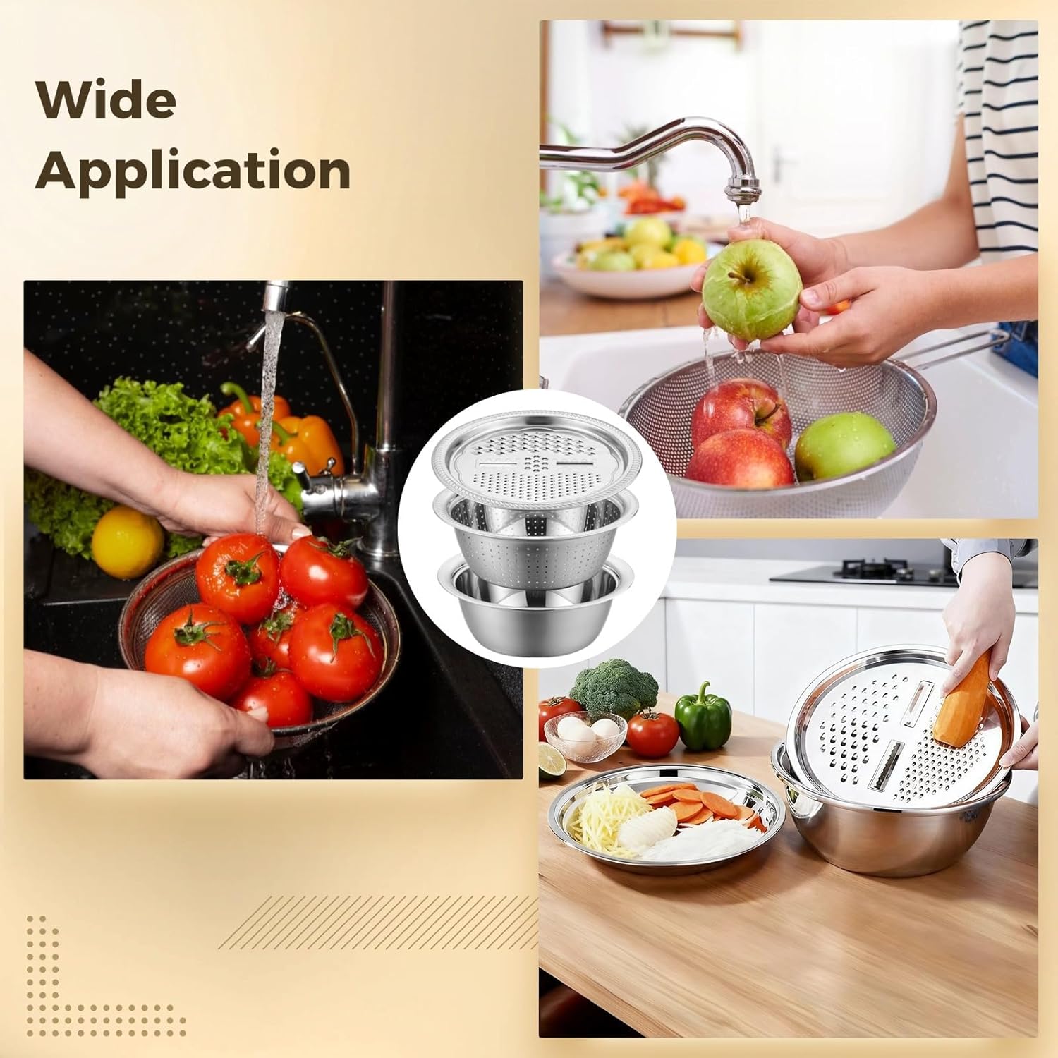Color: Silver Material: 410 Stainless Steel Size: Product Size: 12.01 in x 12.01 in x 3.54 in/30.5 cm x 30.5 cm x 9 cm Package Includes: 1 x Solid Basin, 1 x Draining Basin,1 x Grater Note: - Please refer to the measurement. Tiny measuring error is allowable in normal range. - There might be a little color difference due to the monitor, camera or other factors, please refer to the physical item.